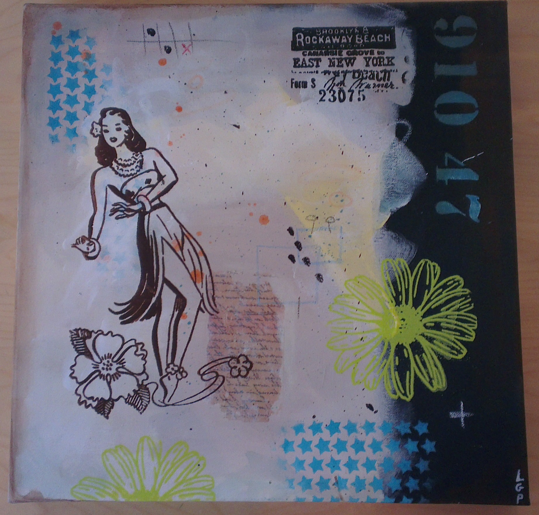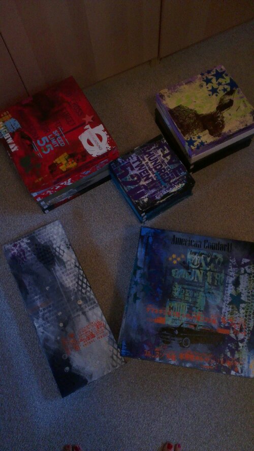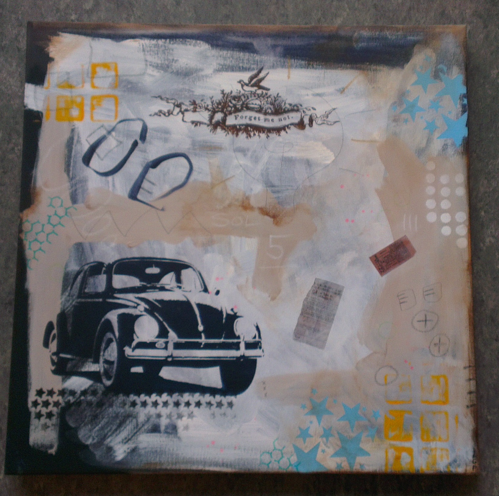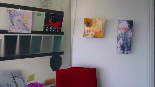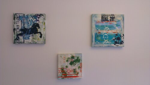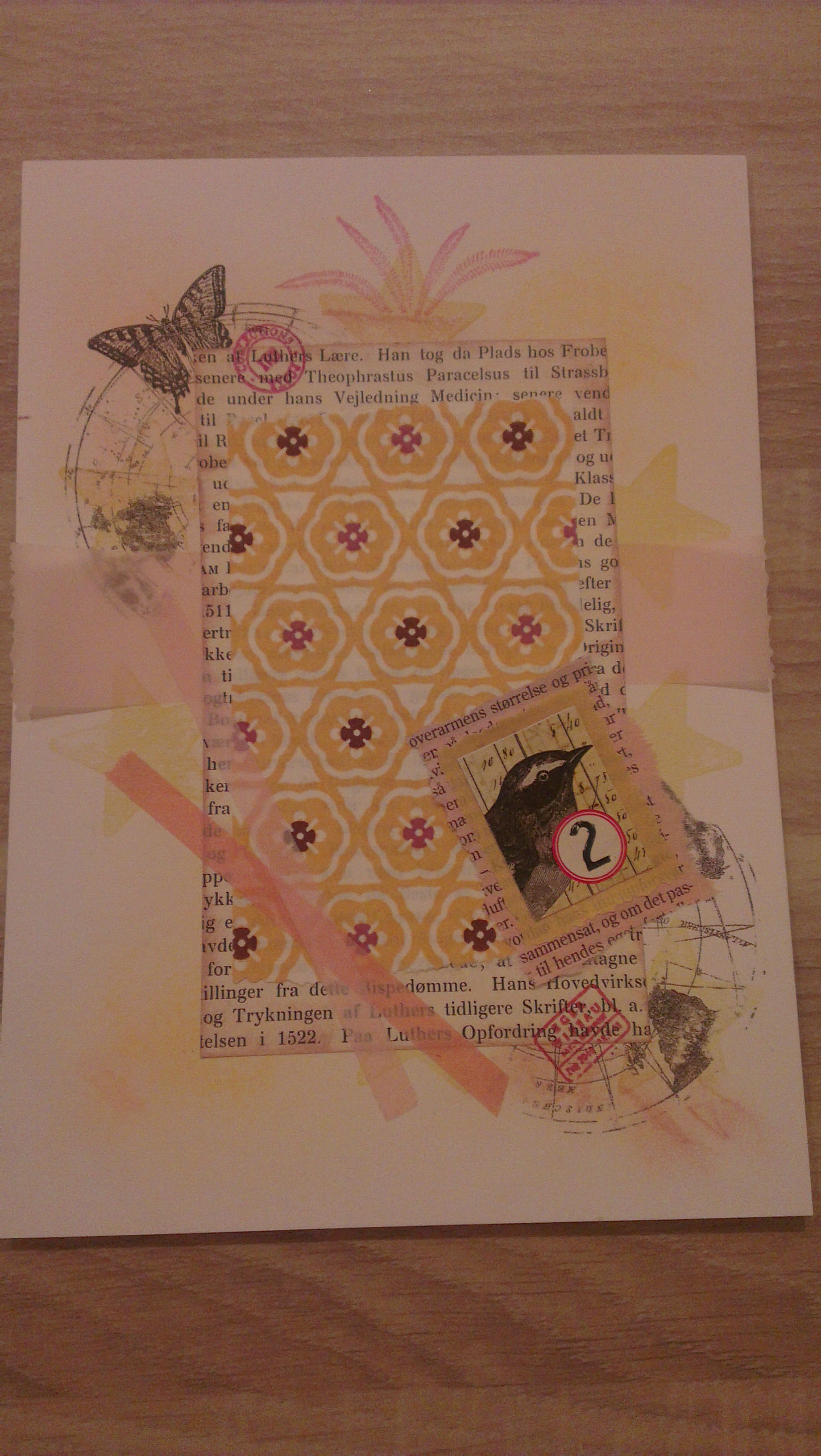 Jeg måtte hurtigt samle lidt materialer sammen, der egnede sig til at tage med – jeg ville gerne lave noget collage på papir – så jeg pakkede nogle stempler, ink spray og scrap.