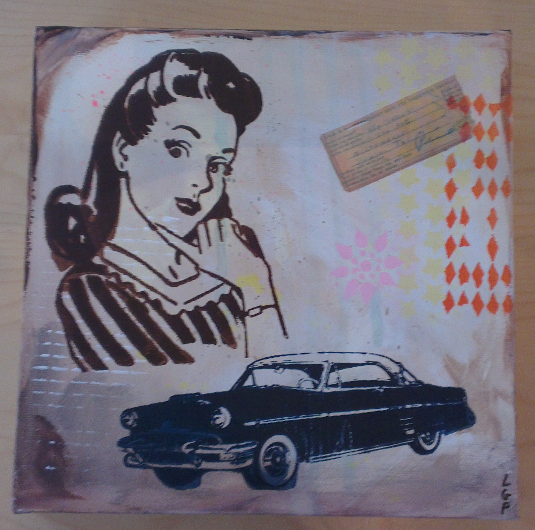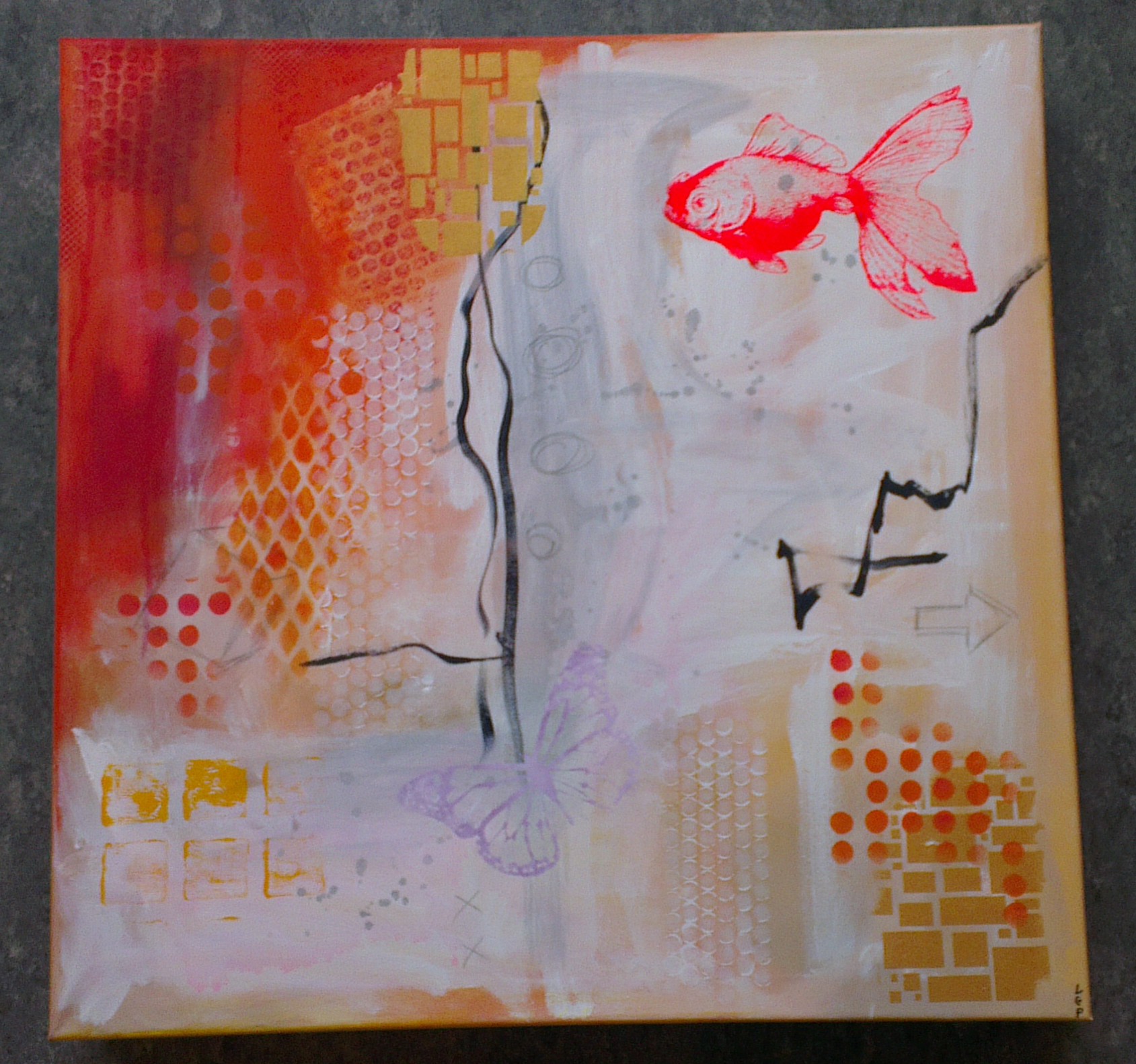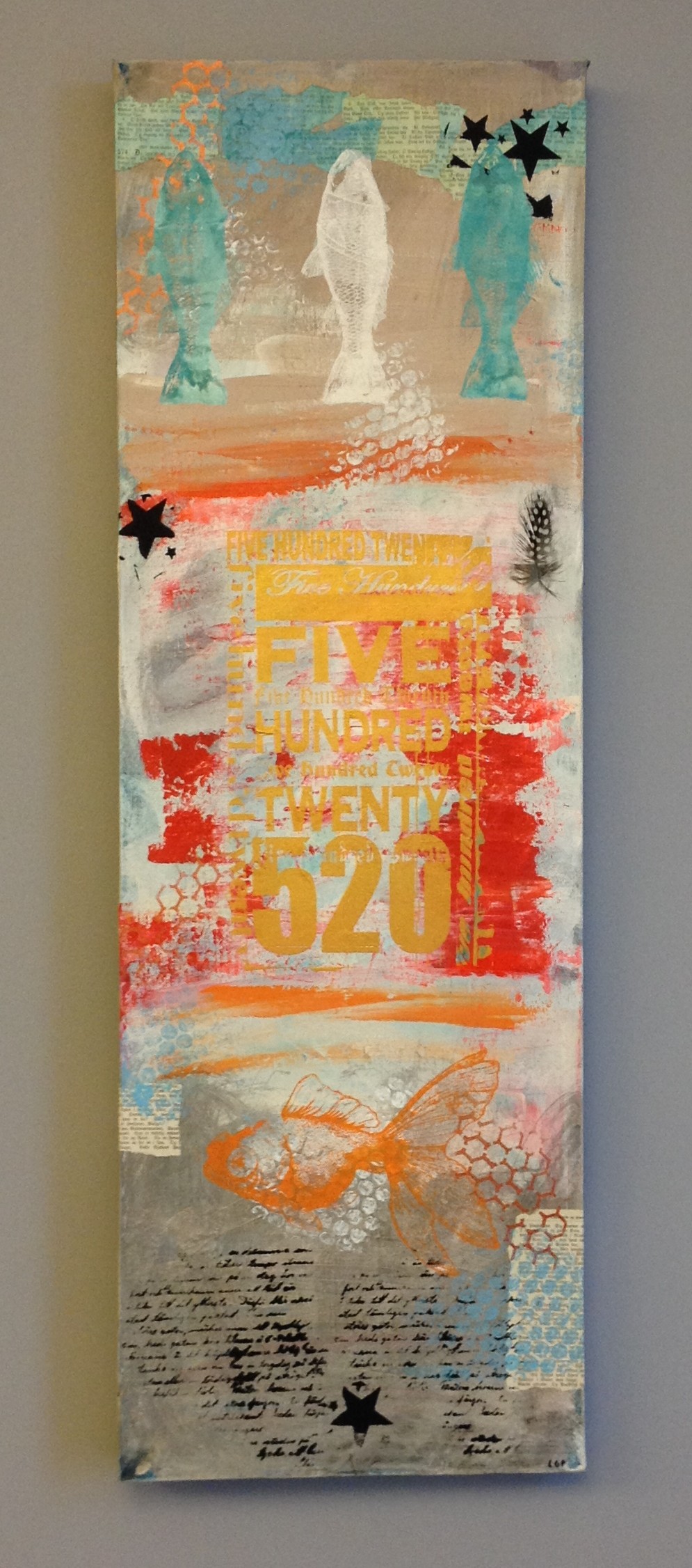 Jeg måtte hurtigt samle lidt materialer sammen, der egnede sig til at tage med – jeg ville gerne lave noget collage på papir – så jeg pakkede nogle stempler, ink spray og scrap.